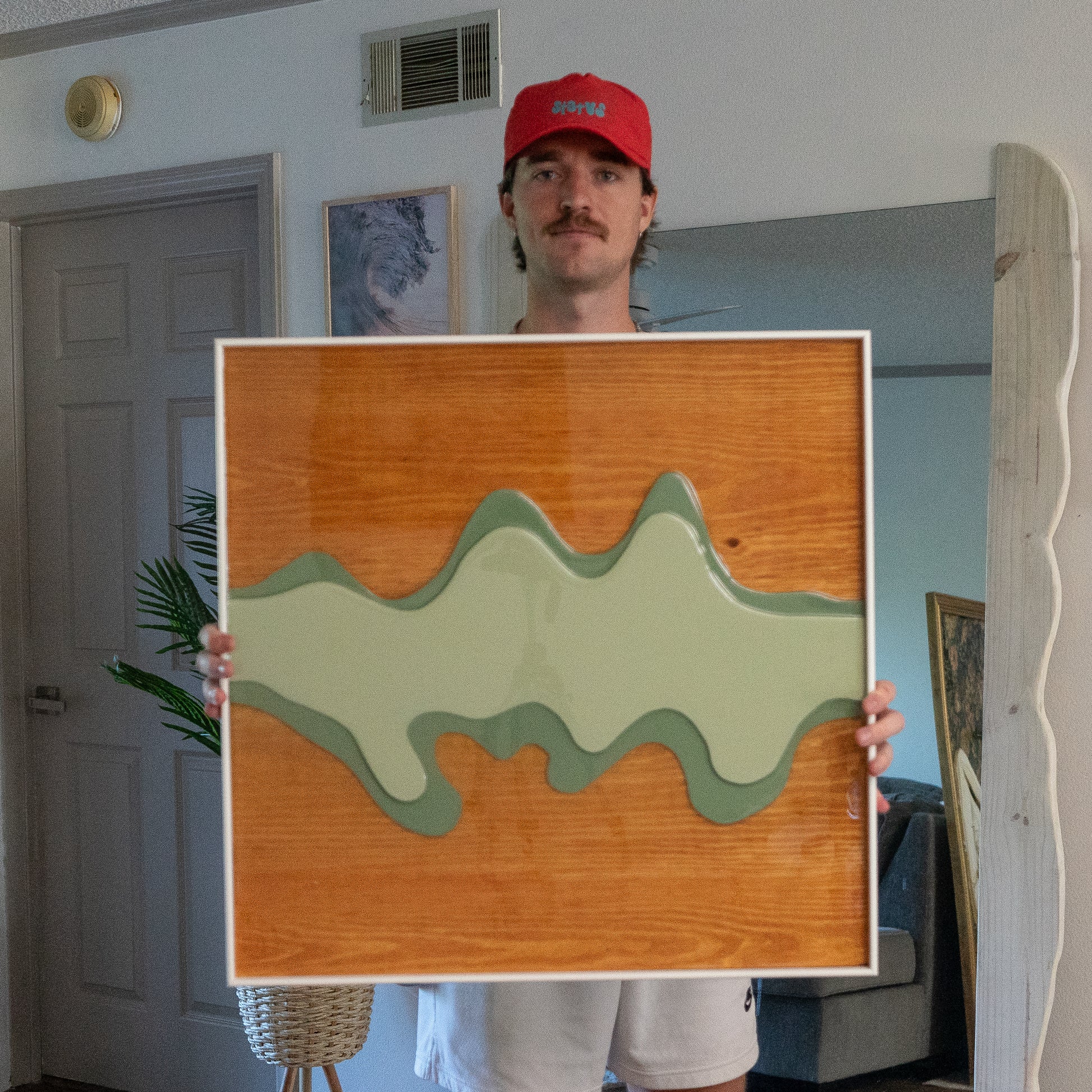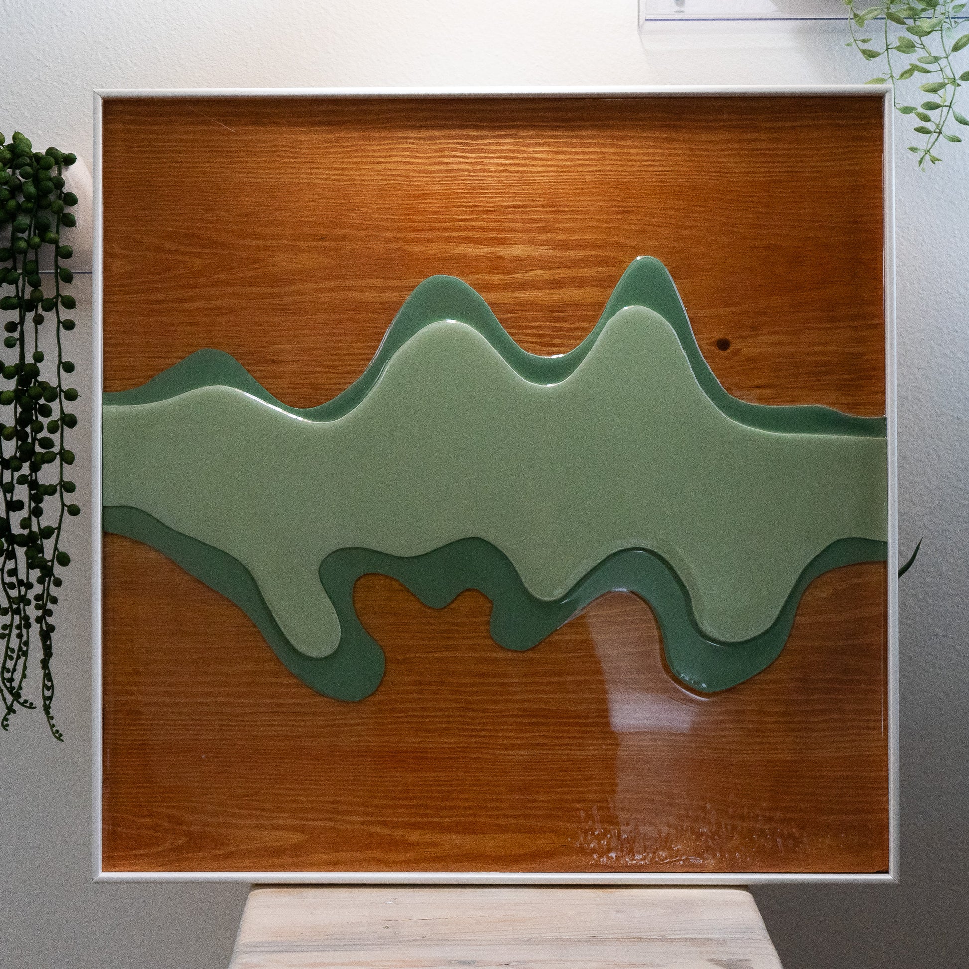 Wall art made from sealed layered wood, painted, and then flood coated in epoxy. Finished off with a thin white frame